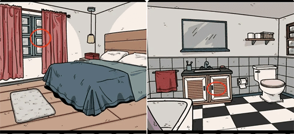 1、卡丽莎视角,先留意卧室窗户上的符号(房子各个场景窗户上有类似符号)后面会用到,四处搜索在二楼卫生间的柜子里找到一只收集要素。