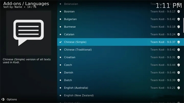 此时返回到主界面,点击Add-on(插件),找到"Install From Repository",再依次选择Look & feel→language,找到中文简体Chinese(Simple),安装后启用,即可启用中文界面