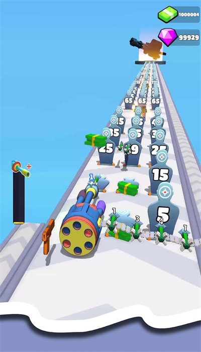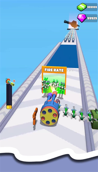 2、迷你枪战跑中躲避沿途障碍物,收集强化道具,保持高速前进并击败对手;